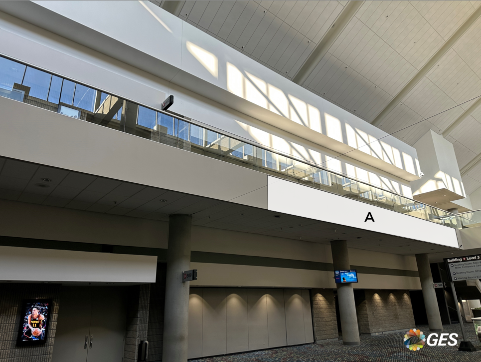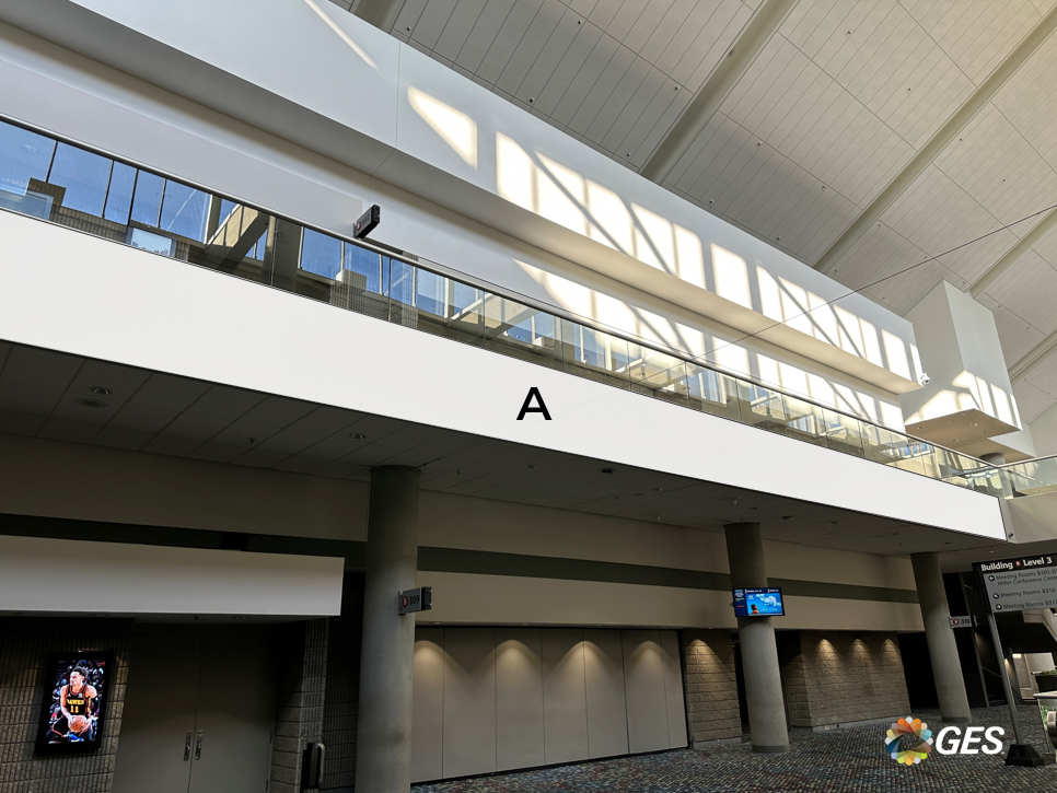 - Located in the Building B level 4 overhang visible from level 3 (Banner above education area doors)